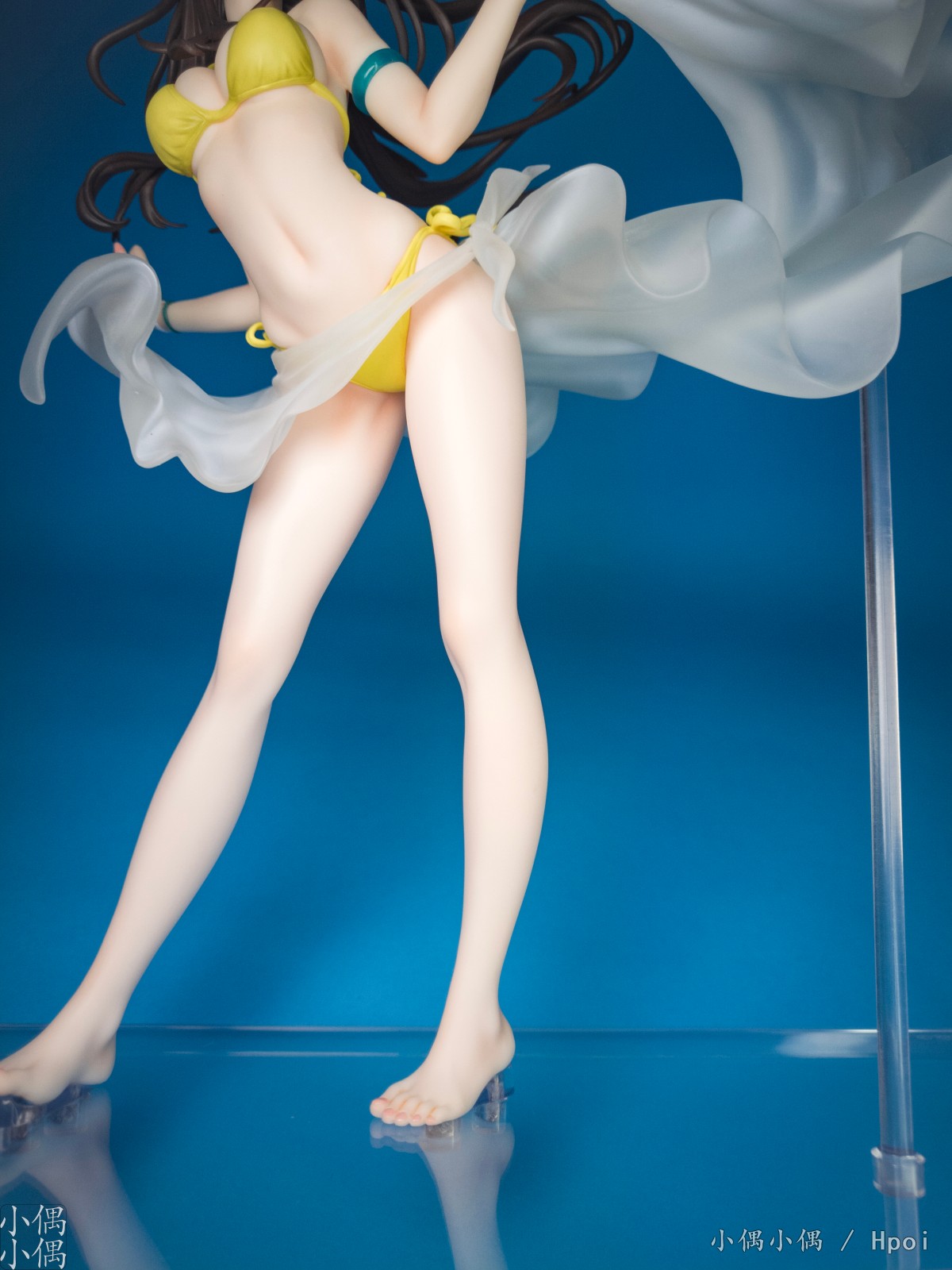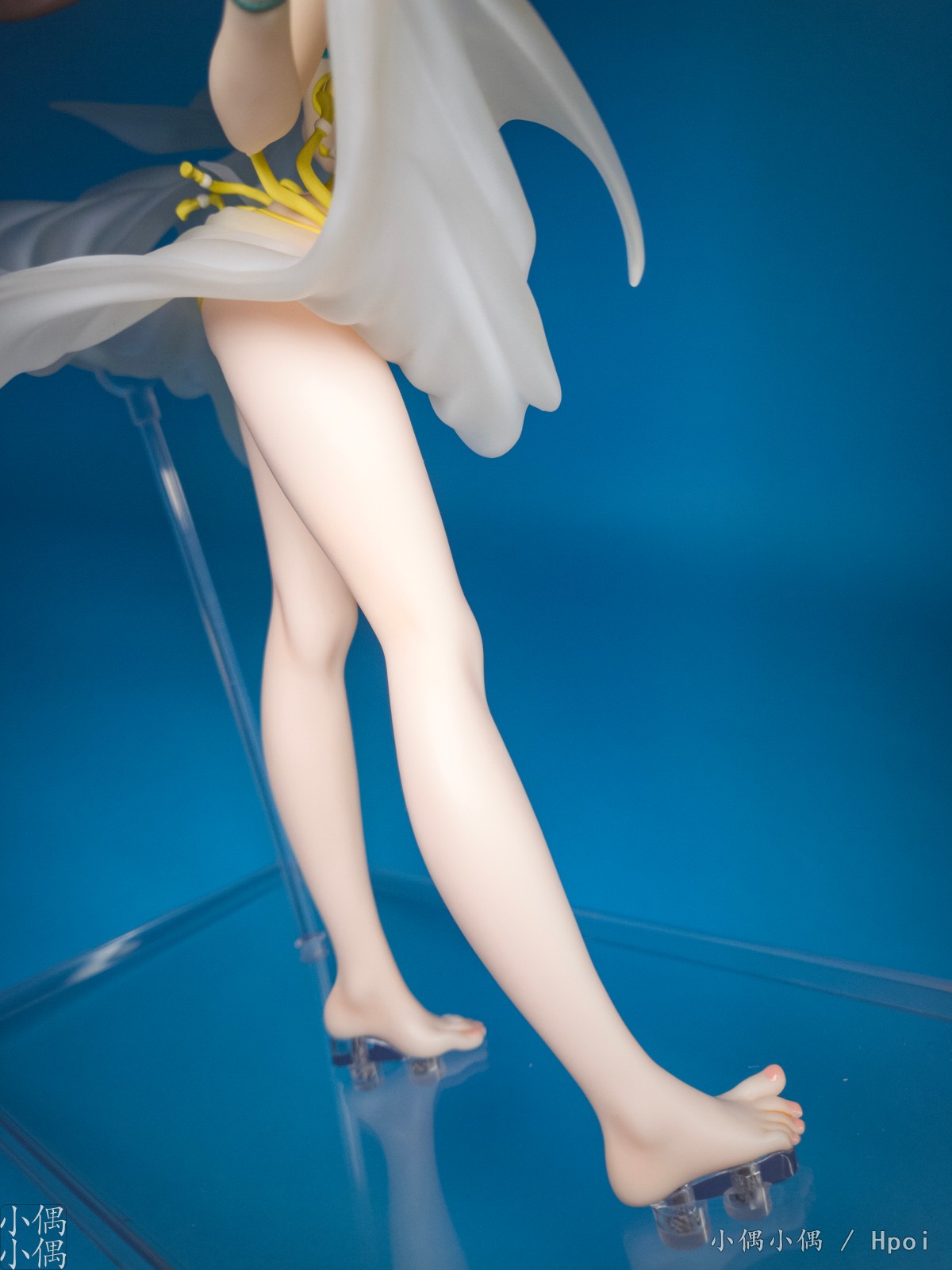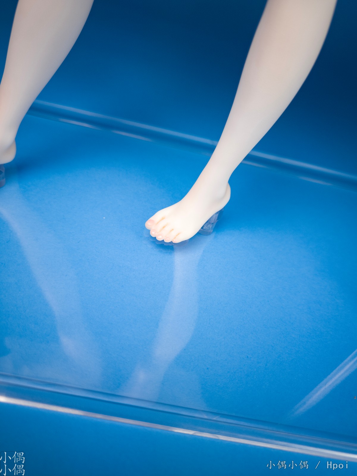 右脚的大拇指是翘起的,并且地台这部分有垫高。