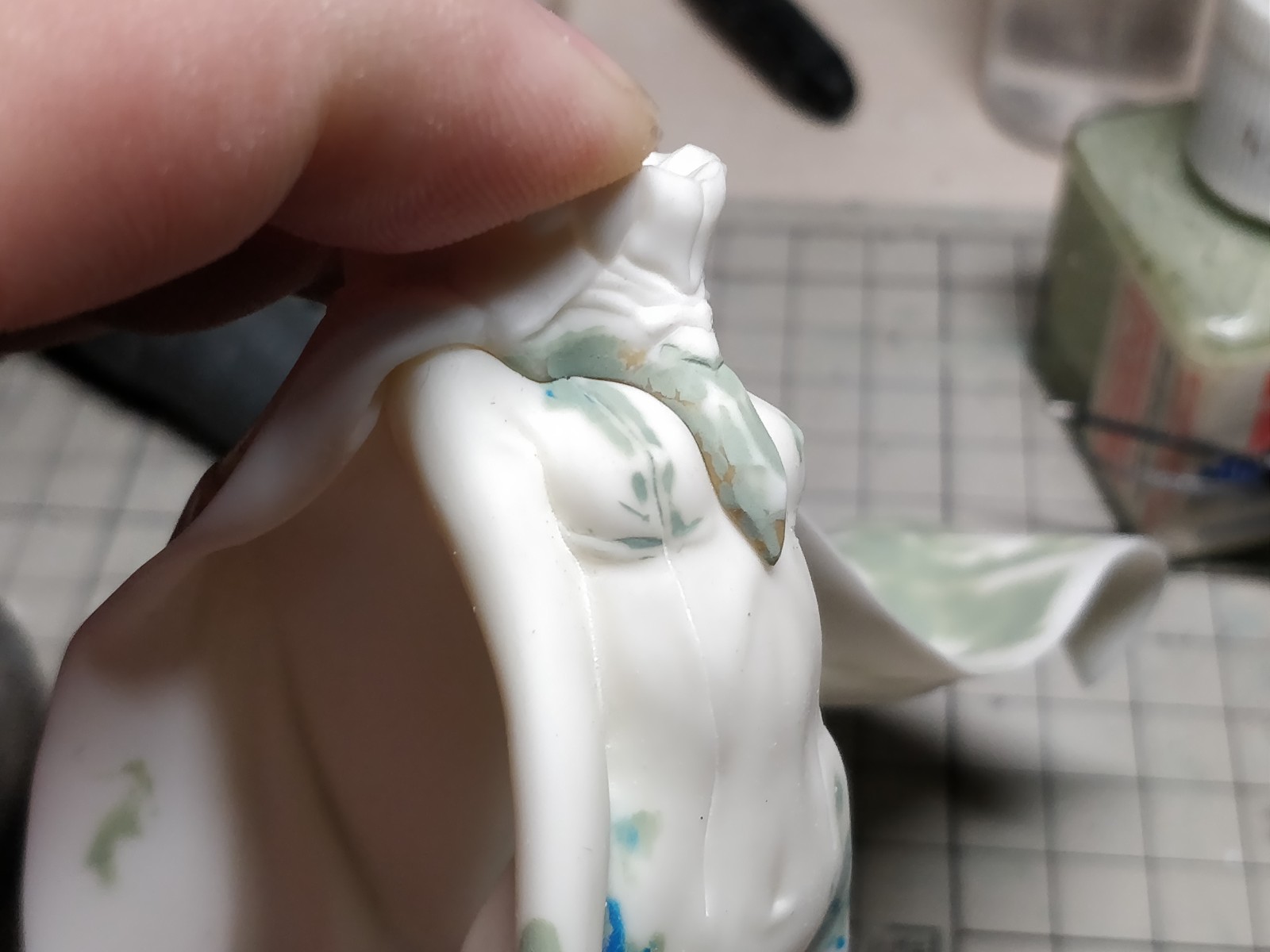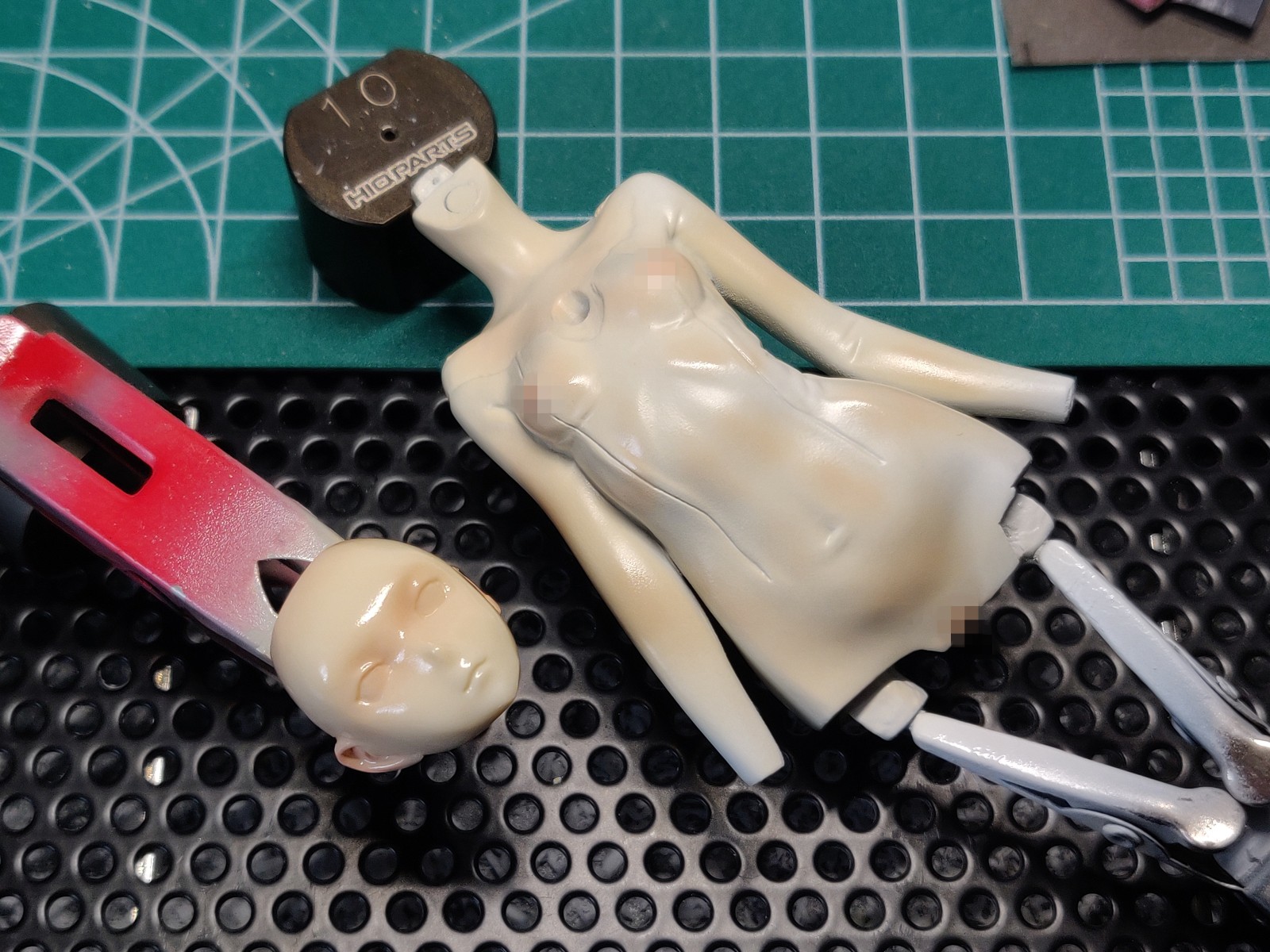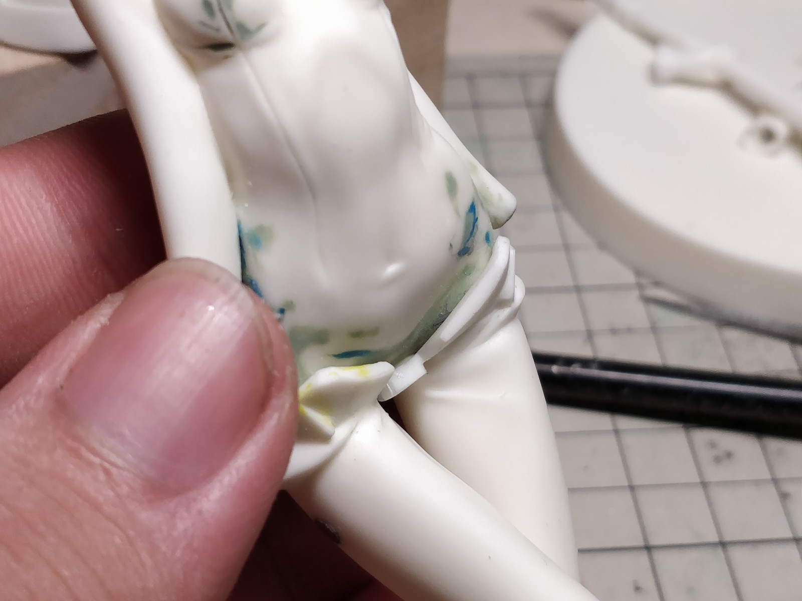 涂装时候试了很多效果和技巧,先多试试以后清堆积就不慌了。身体部分先在肌肉突出的部分喷上了一点肤色,(关键地方就一点点透明红,怕和谐还是马赛克了)然后用finishers比较冷灰的贝壳白喷了白丝。脸部是做透色的,打底用透明补土,喷完肤色后手涂眼睛。