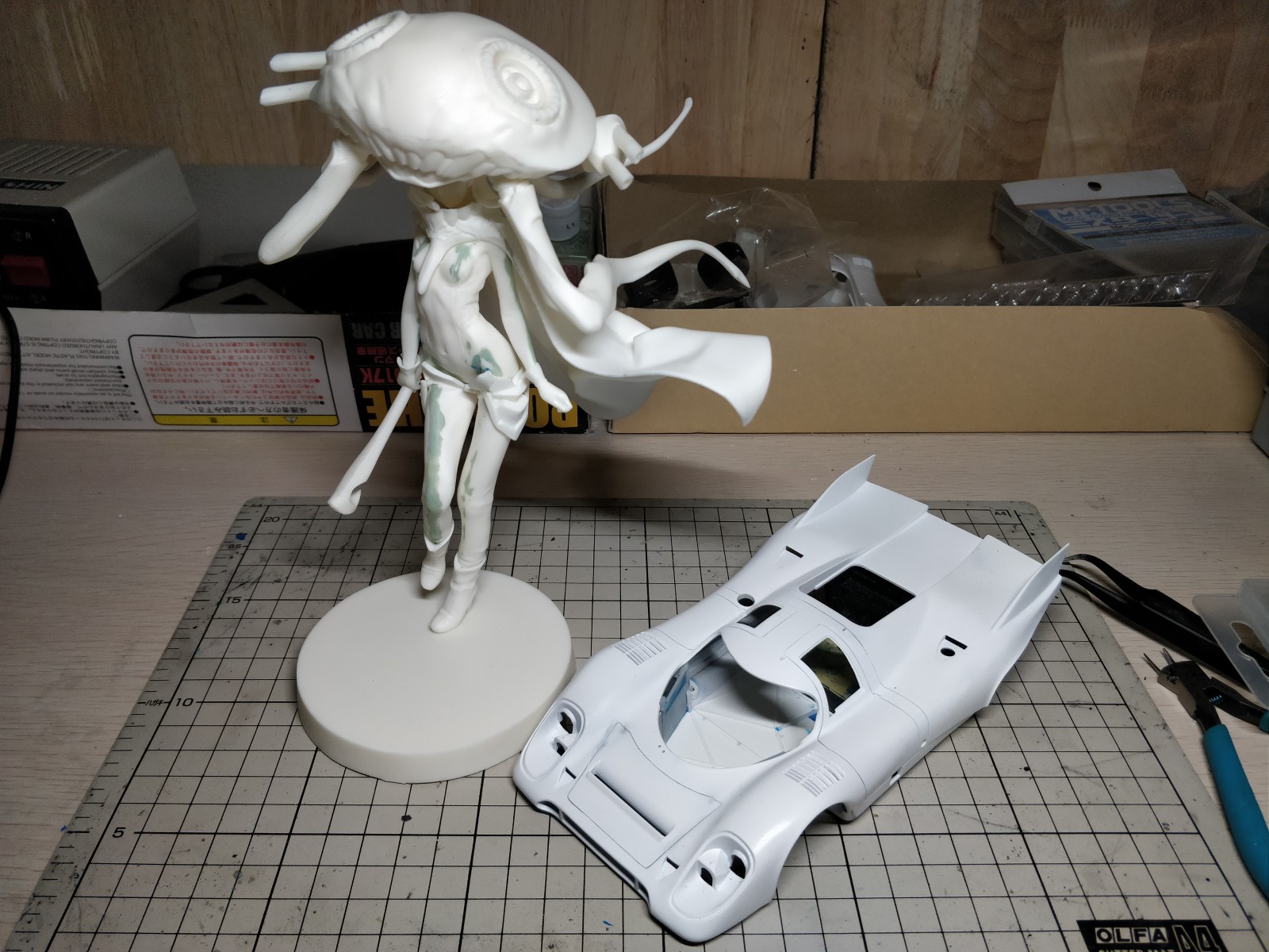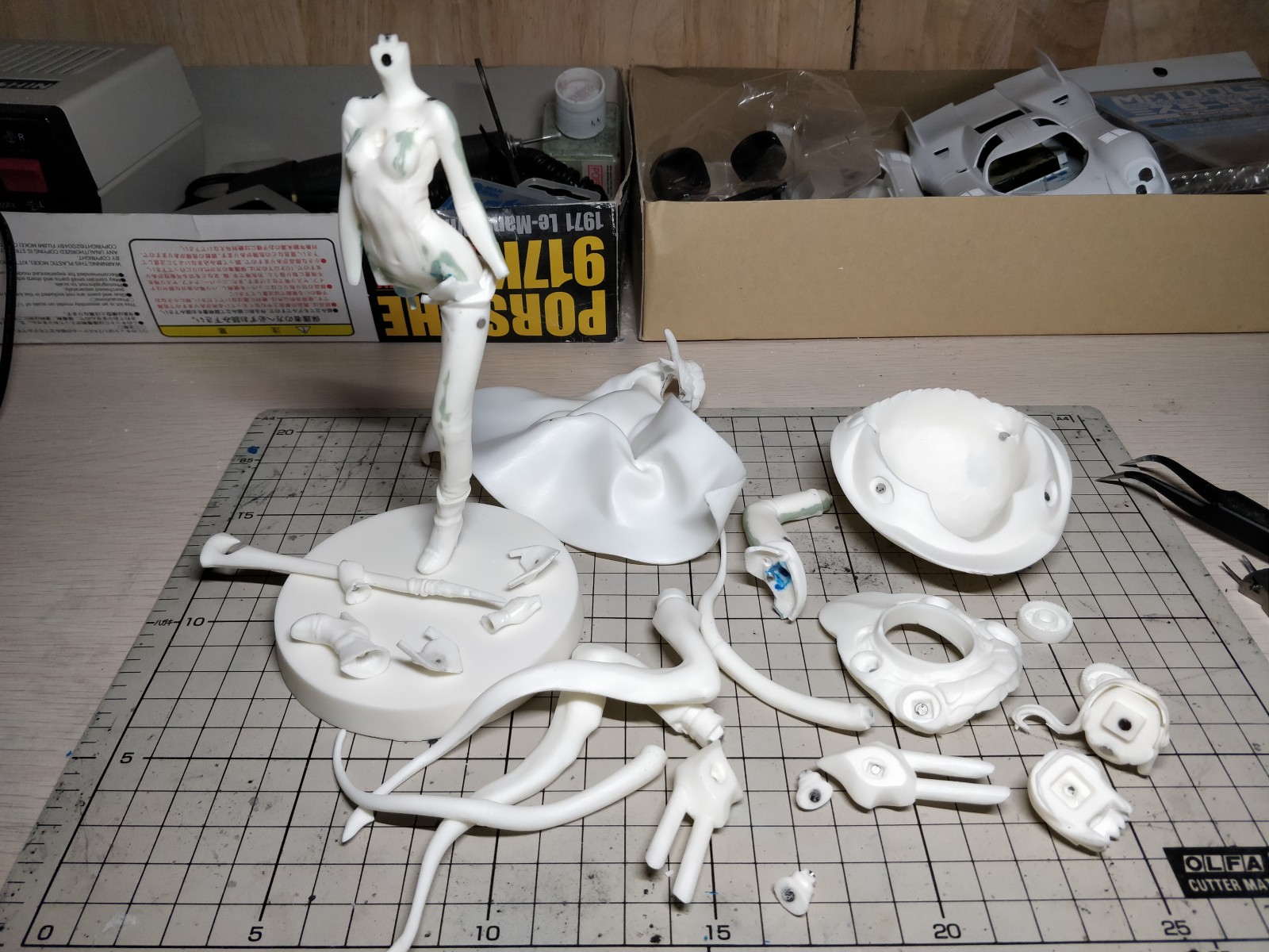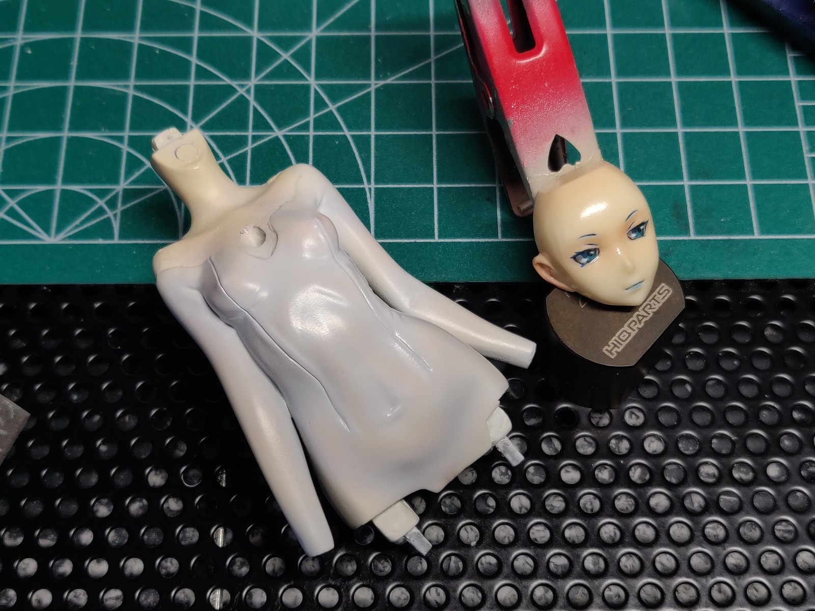 涂装时候试了很多效果和技巧,先多试试以后清堆积就不慌了。身体部分先在肌肉突出的部分喷上了一点肤色,(关键地方就一点点透明红,怕和谐还是马赛克了)然后用finishers比较冷灰的贝壳白喷了白丝。脸部是做透色的,打底用透明补土,喷完肤色后手涂眼睛。