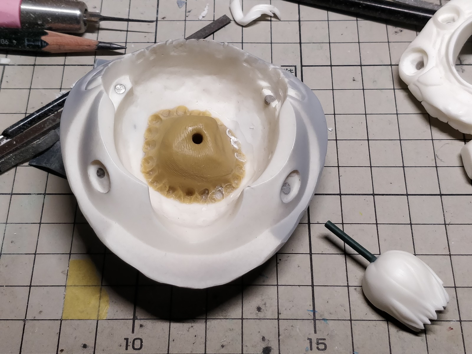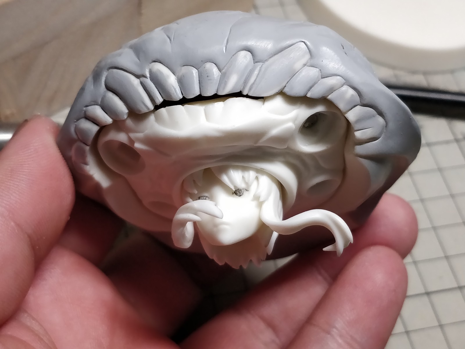 wo酱本体部分的原件比较圆滑。我想要还原一点礁石的感觉,用推刀推出一些凹槽裂痕后喷上testors的场景质感喷罐把表面变粗糙。最后水性漆扫出各种色差。大牙、腮和触手部分喷涂后都用了淡珐琅漆做渍洗。