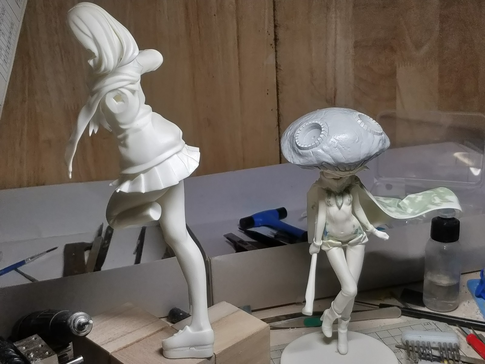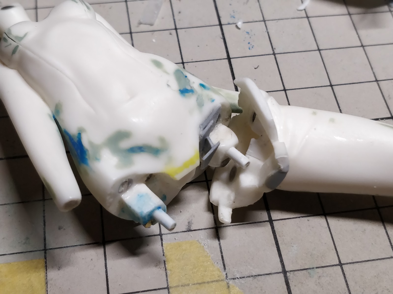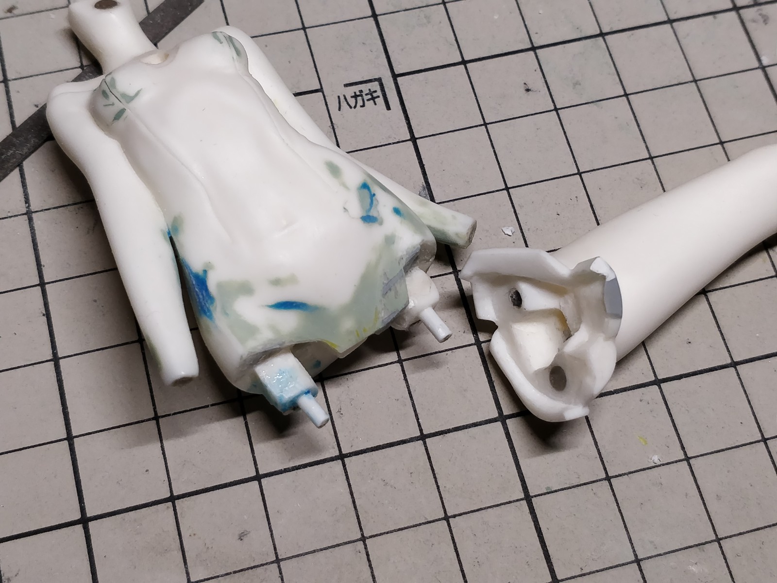 裤子的固定位也有点穿帮,可以看到里面的大固定方桩。用胶板和补土做了一些腿和胯的延伸,刁钻的角度看也会感觉是白丝穿皮裤而不是拼接腿了。