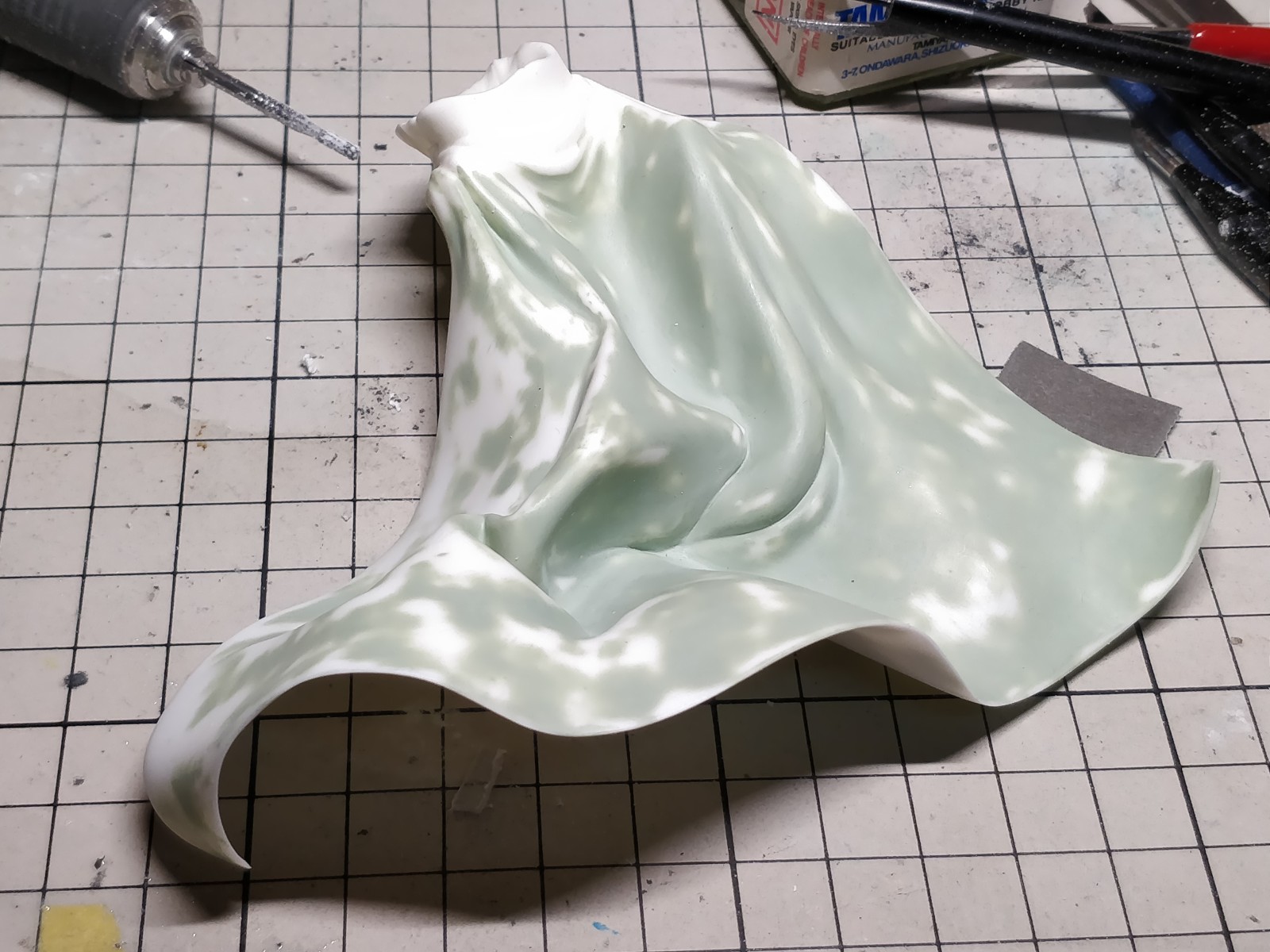 皮披风的组合度不是很好,胸口的固定位置也是盾圆形的。用AB土塑性以后吧胸口改成了一个尖角,皮衣上的各种凹坑也顺便磨平。波波被我削掉了一层,一是能塑出一点点激凸,二是我很少喜欢大胸角色=。=